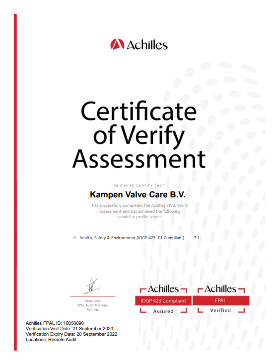 Kampen Valve Care BV has succesfully passed the FPAL verify audit with a 7.1 ranking on Health, Safety and Environment meaning the company is fully IOGP 423-01 Compliant.